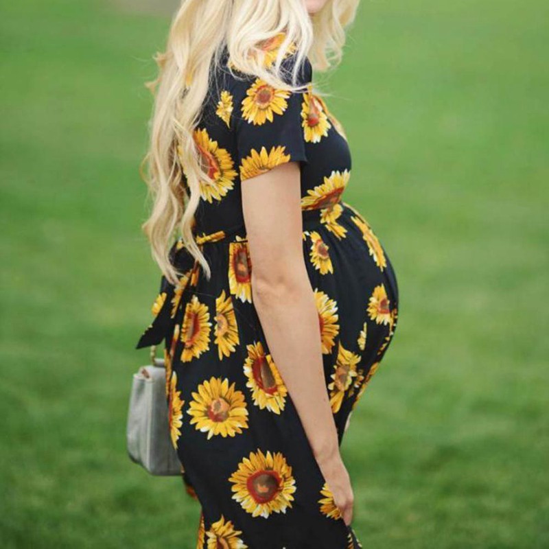 New Womens Fashion Sunflower Print Pregnant Dress Summer Maternity