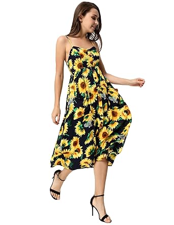 Women Spaghetti Strap Button Down Maternity Sunflower Dress With
