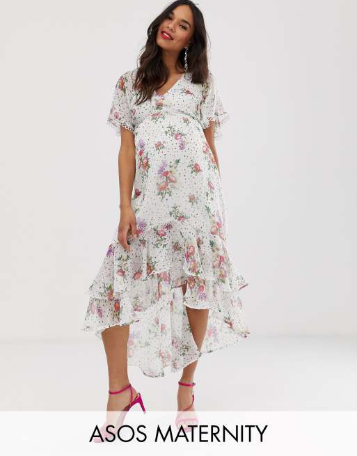Asos Design Maternity Midi Dress In Spot And Floral With Lace And